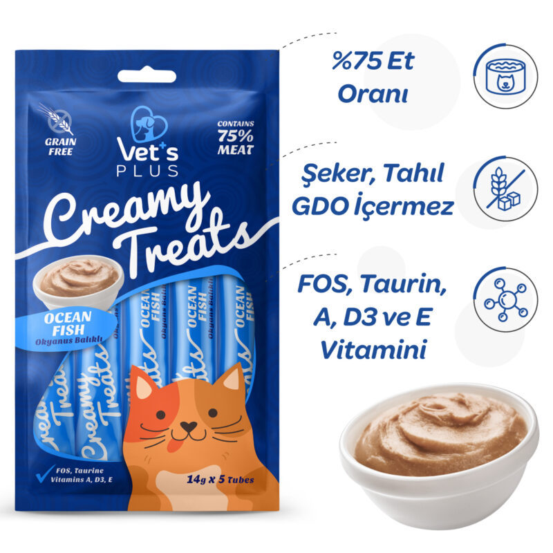 Lezzetli ve dengeli Vet’s Plus okyanus balıklı sıvı kedi ödül mamasıdır.