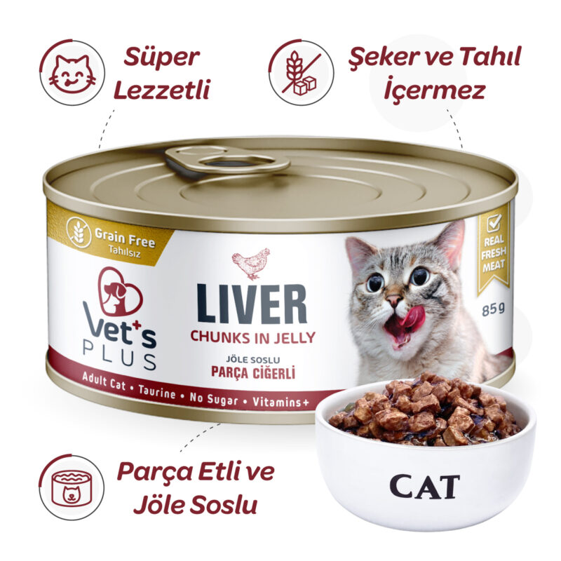 Vet’s Plus jöle soslu parça ciğerli konserve, içerdiği A, B, D, E vitaminleri sayesinde sağlıklı tüy gelişimini destekler, hücre yenilenmesine, kas ve iskelet sisteminin gelişimine yardımcı olur. Enfeksiyon, eklem rahatsızlıkları, alerji ve solunum yolu rahatsızlıkları gibi stres şartlarında vücudu destekleyip güçlendirir ve bağışıklığı arttırır. Zengin vitamin ve mineral içeriğiyle yetişkin kedilerin günlük aktiviteleri için gerekli enerji ihtiyacını karşılayan dengeli ve sağlıklı tam bir tahılsız besindir.