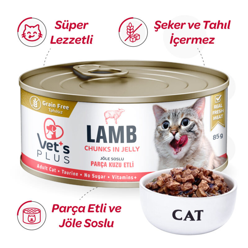 Vet’s Plus jöle soslu parça kuzu etli konserve, içerdiği A, B, D, E vitaminleri sayesinde sağlıklı tüy gelişimini destekler, hücre yenilenmesine, kas ve iskelet sisteminin gelişimine yardımcı olur. Enfeksiyon, eklem rahatsızlıkları, alerji ve solunum yolu rahatsızlıkları gibi stres şartlarında vücudu destekleyip güçlendirir ve bağışıklığı arttırır. Zengin vitamin ve mineral içeriğiyle yetişkin kedilerin günlük aktiviteleri için gerekli enerji ihtiyacını karşılayan dengeli ve sağlıklı tam bir tahılsız besindir.