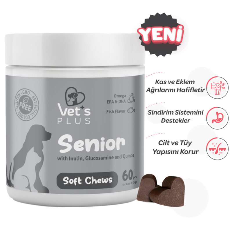 7 yaşından büyük kedi ve köpeklerin günlük vitamin ve mineral ihtiyaçlarını desteklemek için özenle formüle edilmiş çiğnenebilir tablettir.